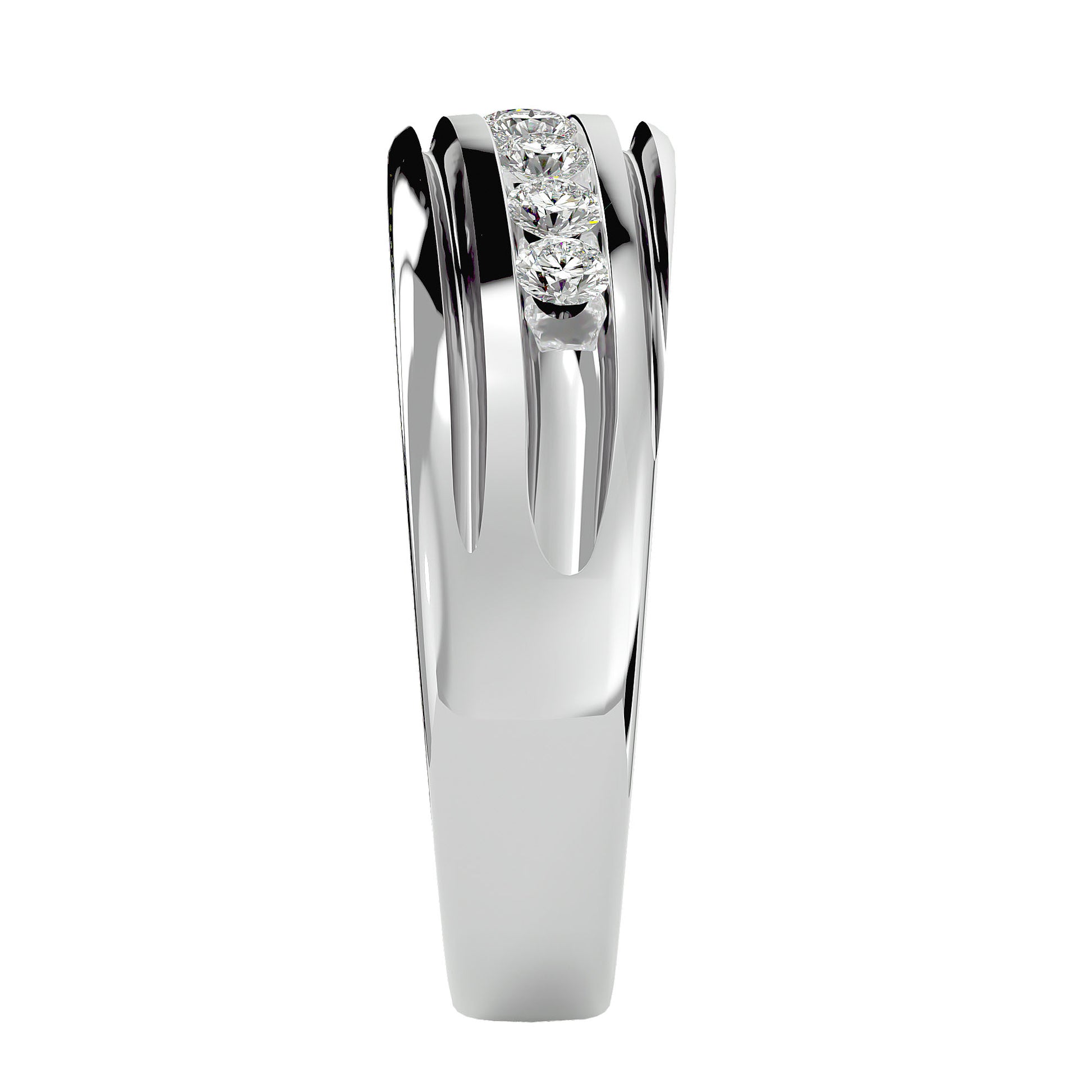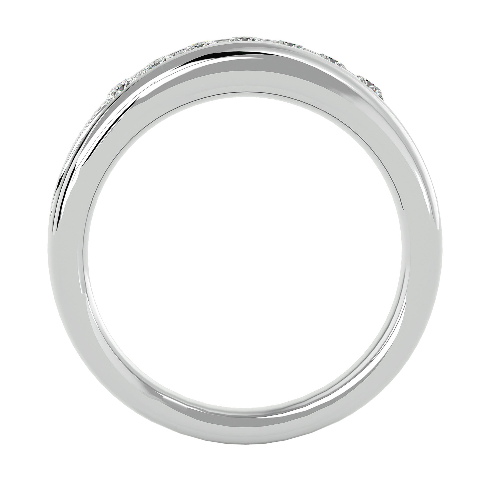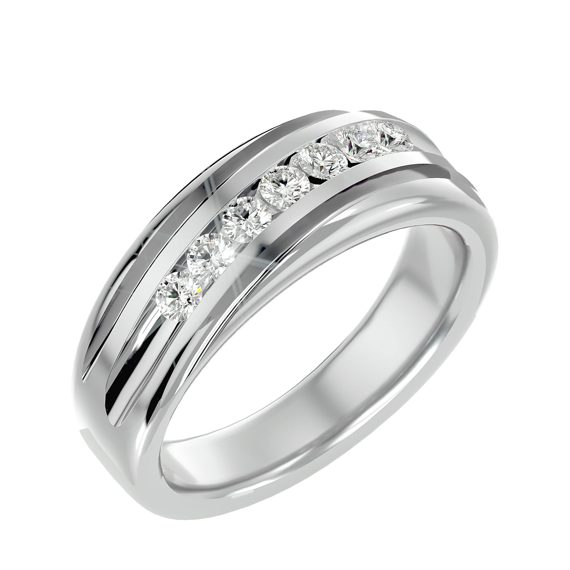 Diagonal setting of round diamonds in channel setting, with a tapered bold shank, creating a strong and masculine look for this men's band.