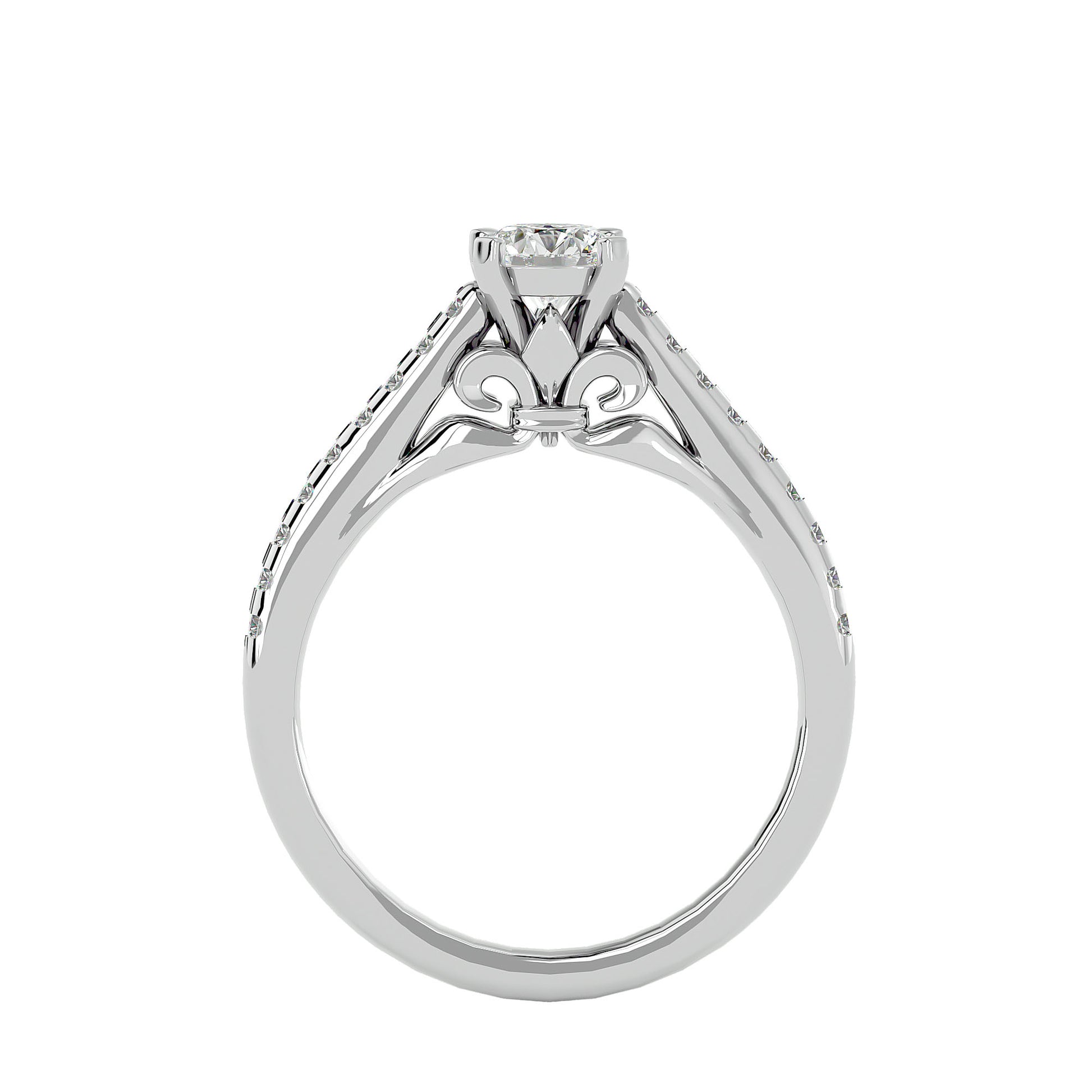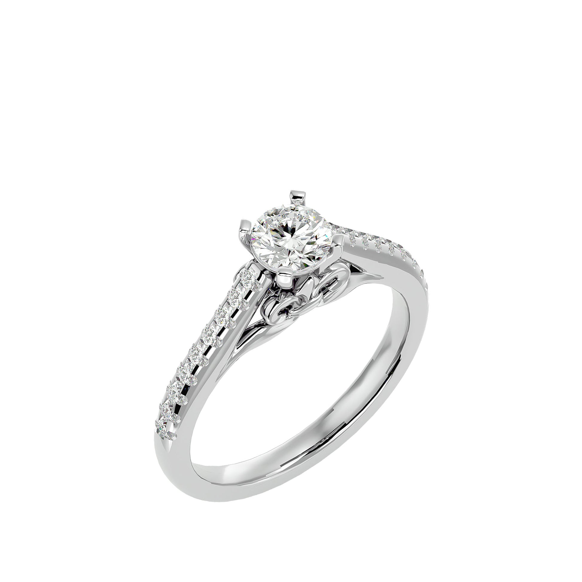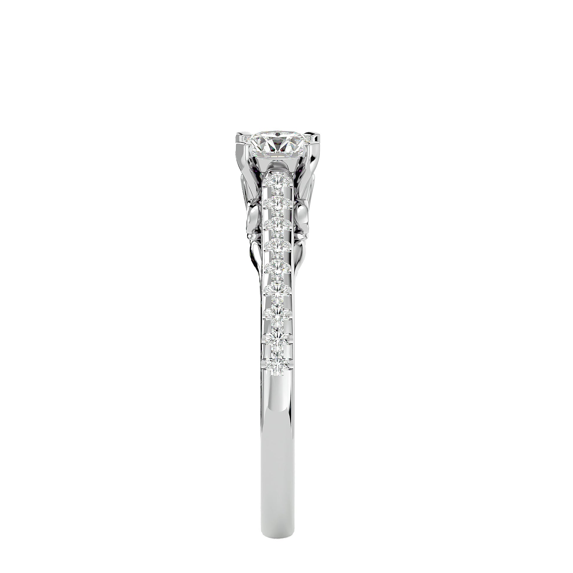 The Dorothy diamond engagement ring features a center diamond in a classic 4-prong setting, with a cathedral shank adorned with micro prong-set diamonds. Intricate filigree detailing on the side adds a vintage-inspired, timeless charm.