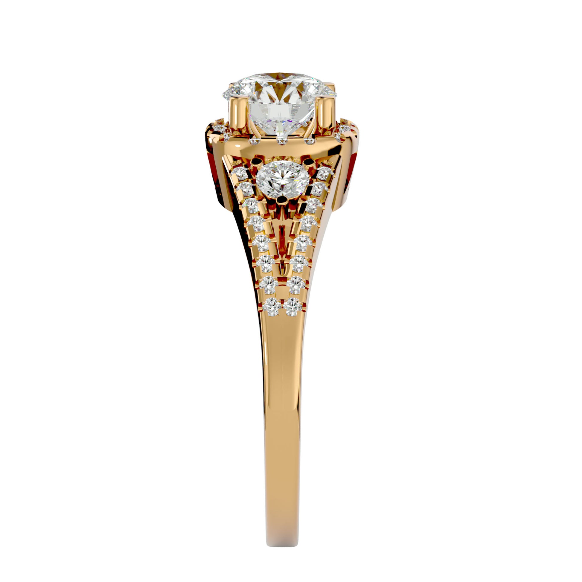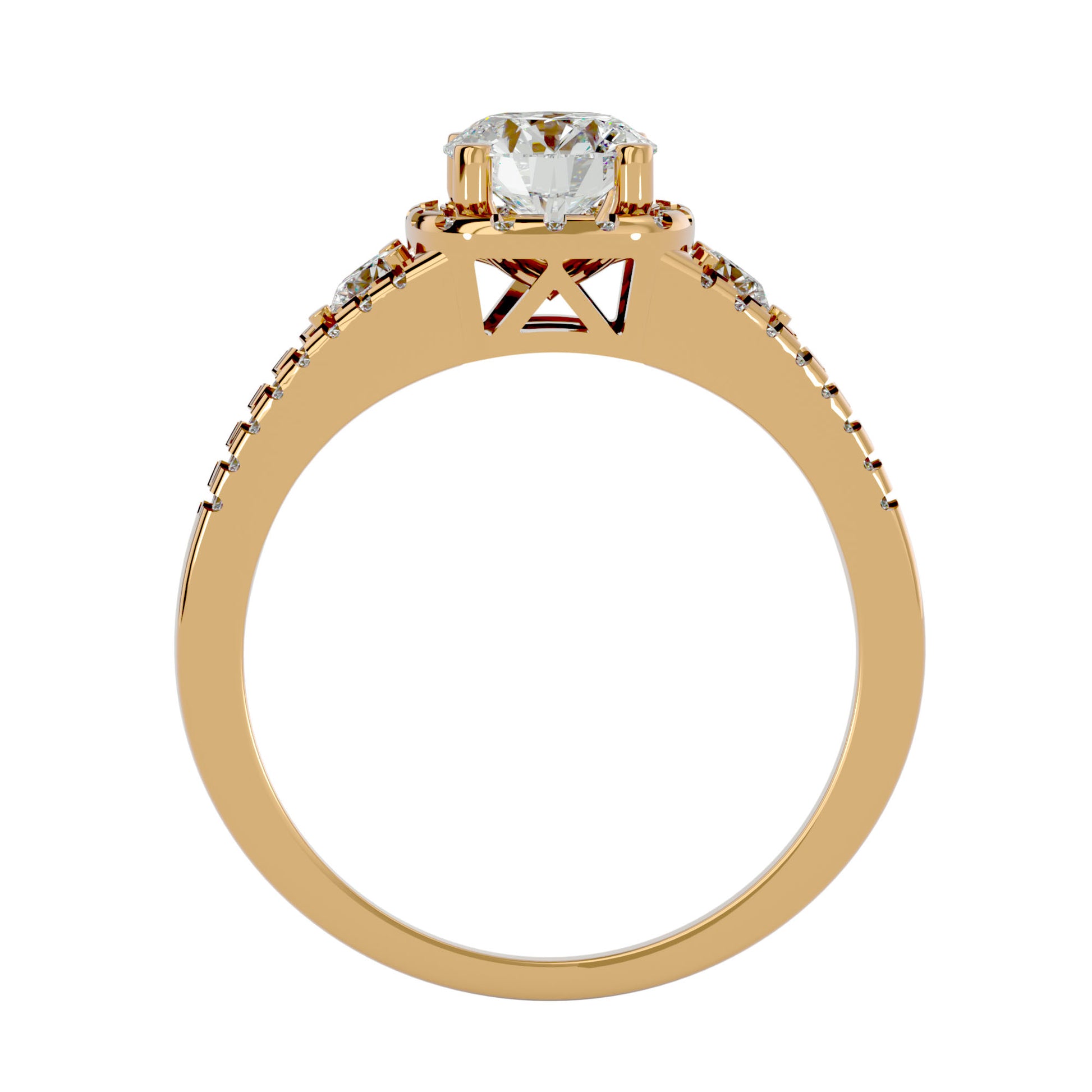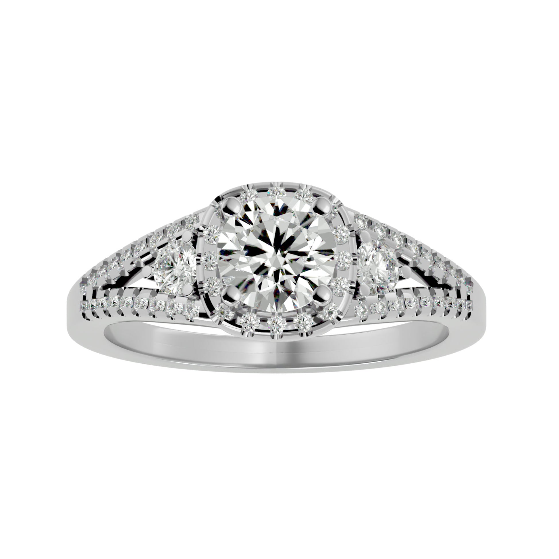 The Gomez Three Stone Halo Diamond Engagement Ring features a dazzling center diamond surrounded by a halo of micro-prong set diamonds. The side diamonds are set in 4-prong settings, and the split shank design is adorned with diamonds up to 50% of its length for added brilliance and elegance.