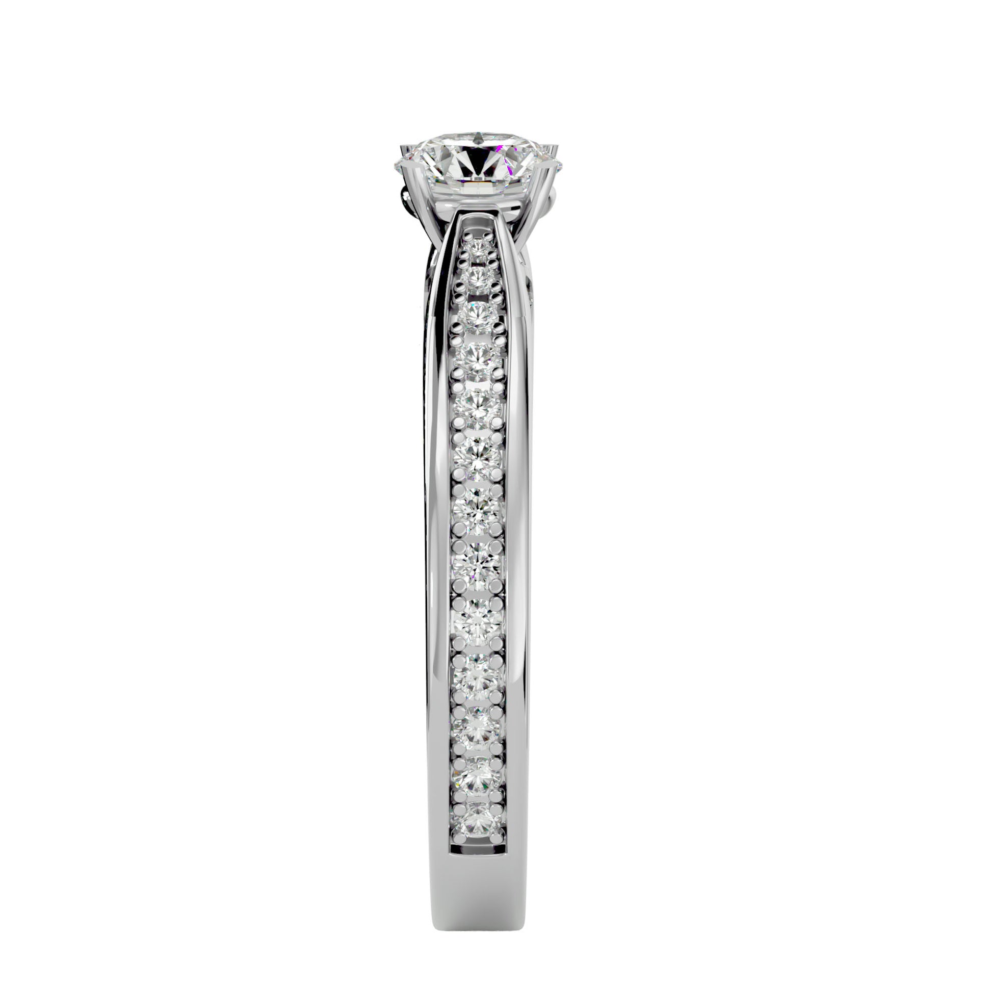 The Ilyana Solitaire Diamond Engagement Ring features a stunning center diamond set in a secure 6-prong setting, with a cathedral shank for added elegance and a smooth, dome-shaped straight shank for a classic, refined look.