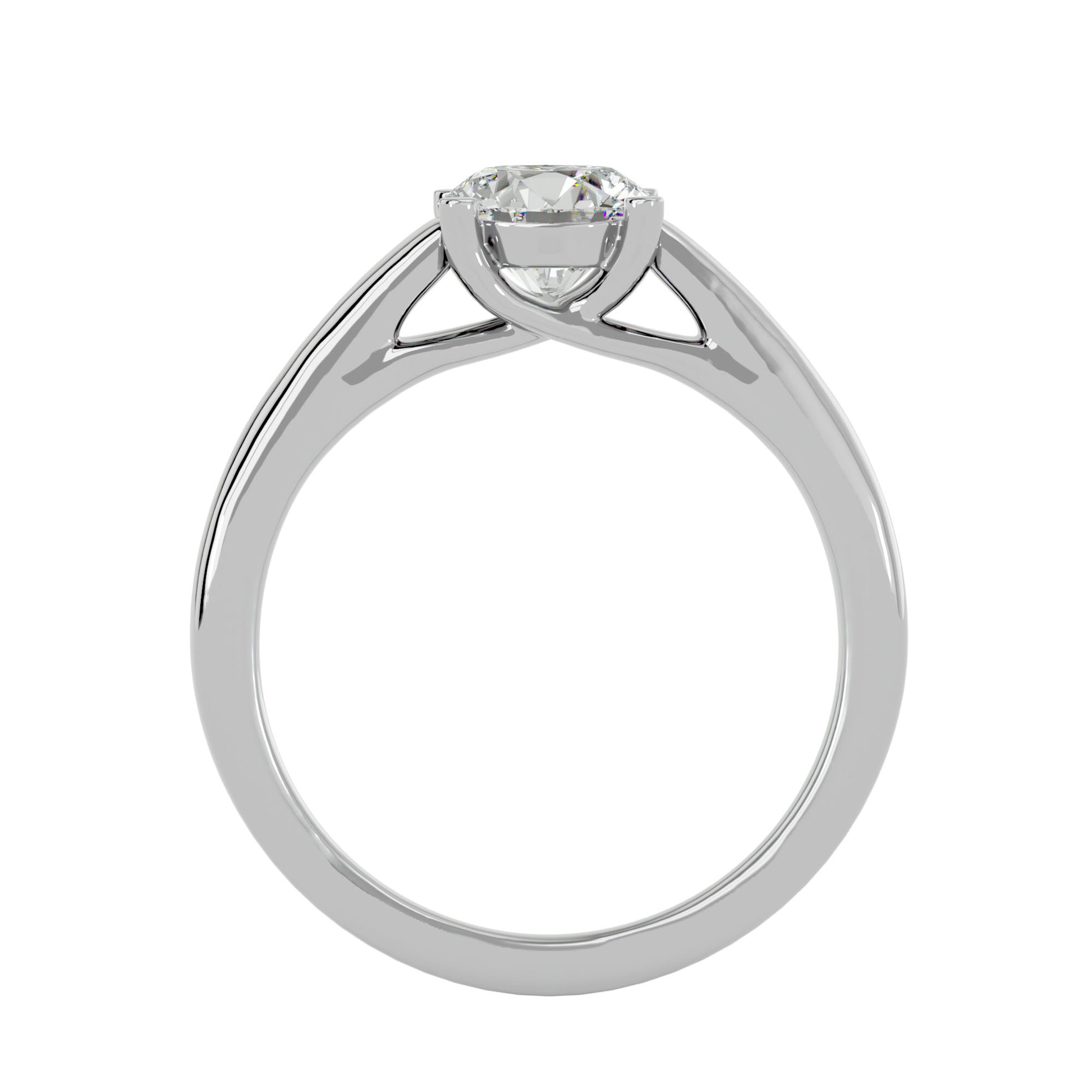 The Johanna solitaire diamond engagement ring features a stunning center diamond set in a classic 4-prong setting, complemented by a solid cathedral shank. The criss-cross metal design is visible from the side, adding a unique and modern touch to the elegant, timeless piece.