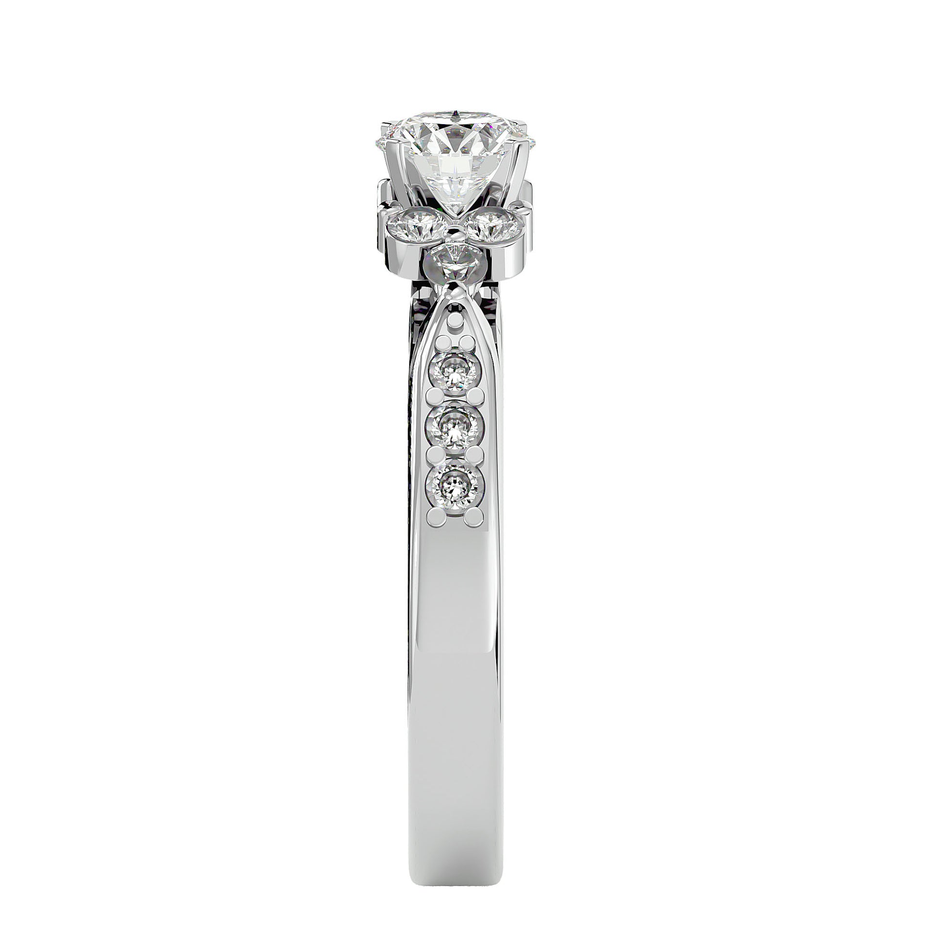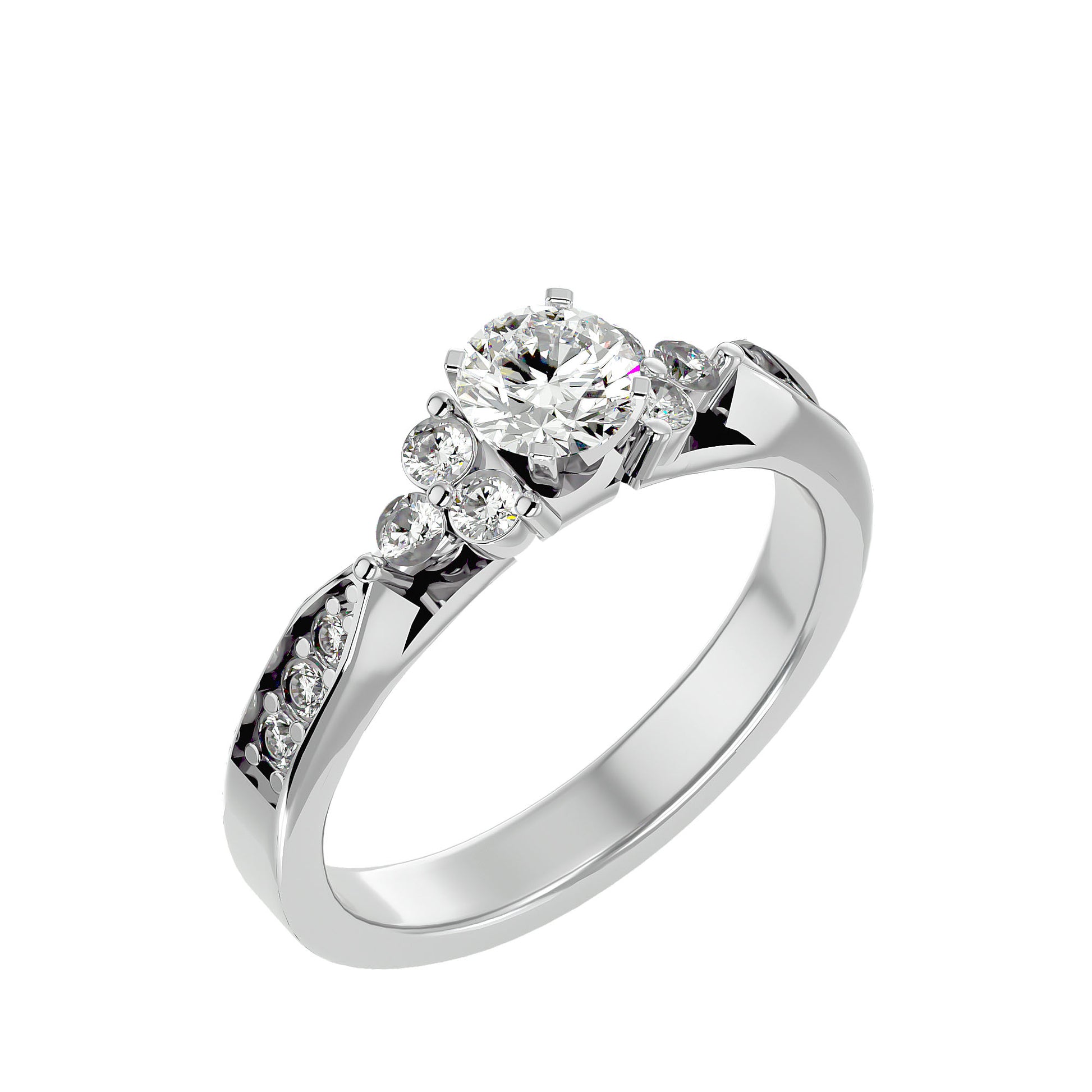 The Liora side stone diamond engagement ring features a beautiful center diamond set in a 4-prong setting. On each side, three diamonds are set in prong settings, adding extra brilliance. The band is adorned with pave-set diamonds, creating a continuous sparkle and enhancing the overall elegance of the design.