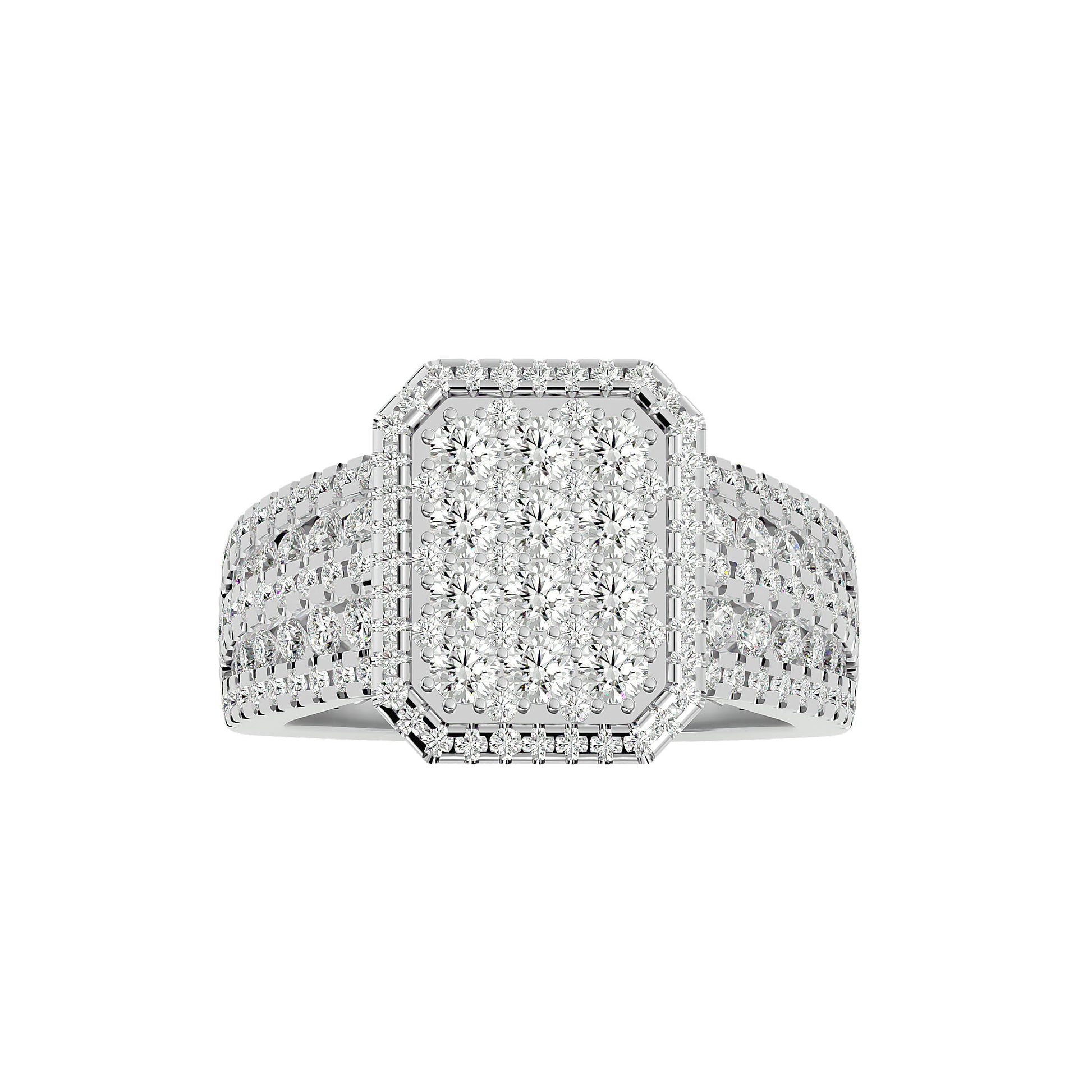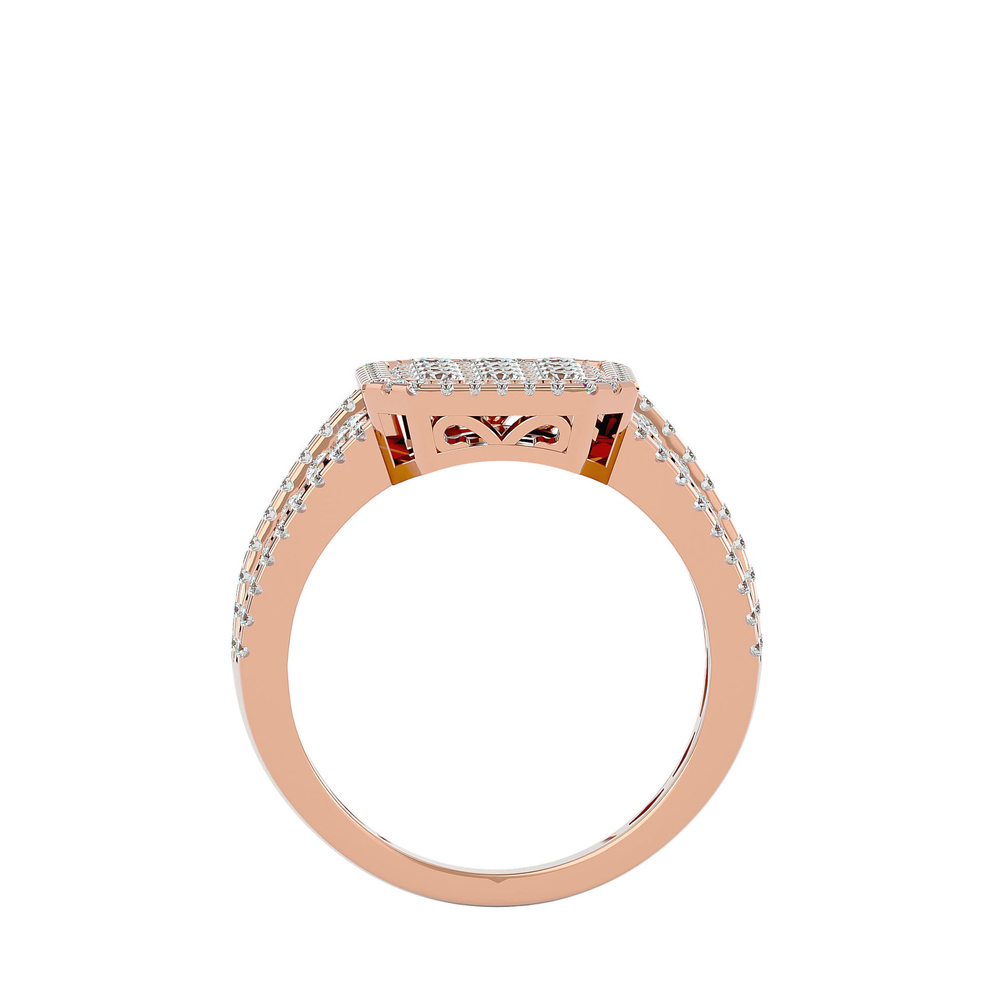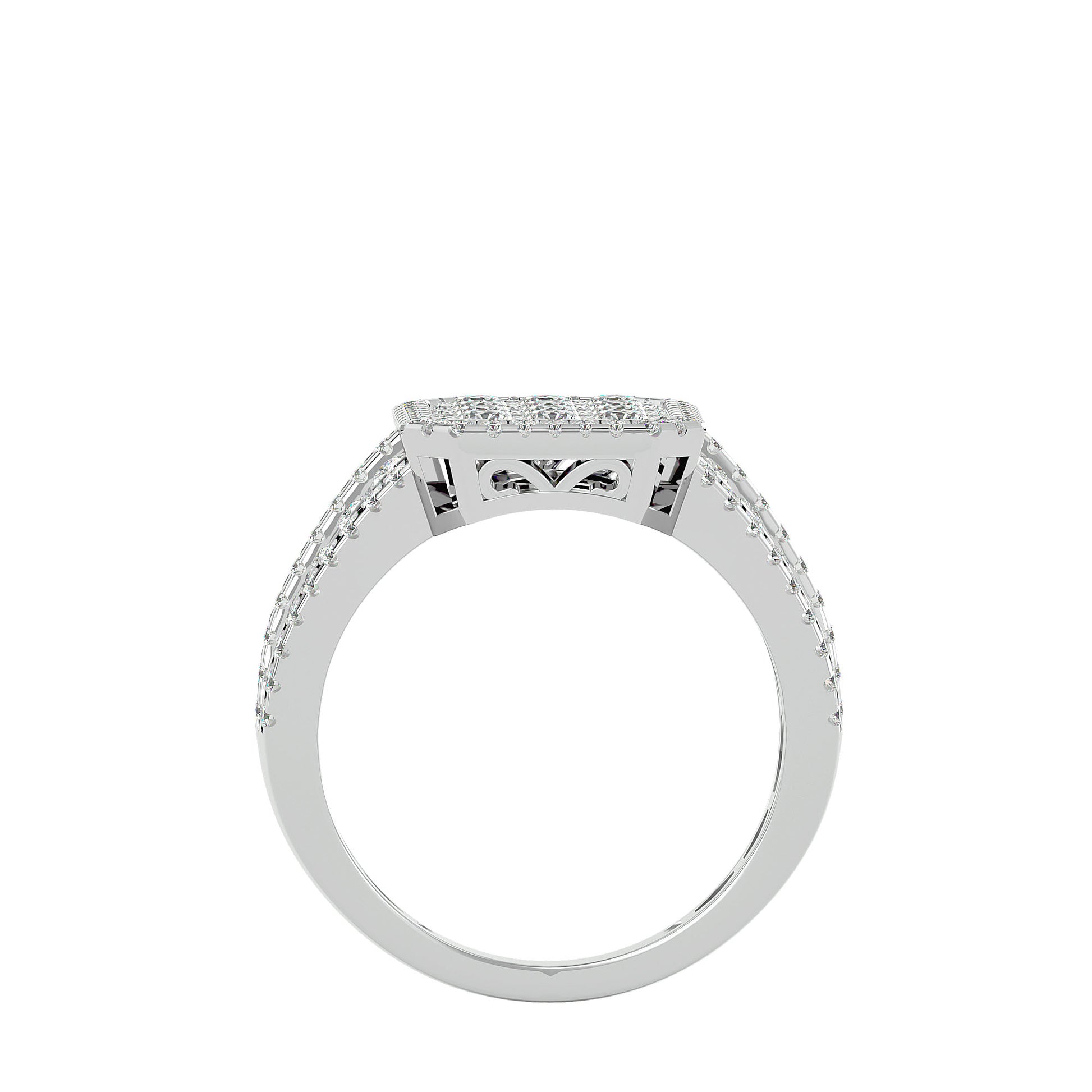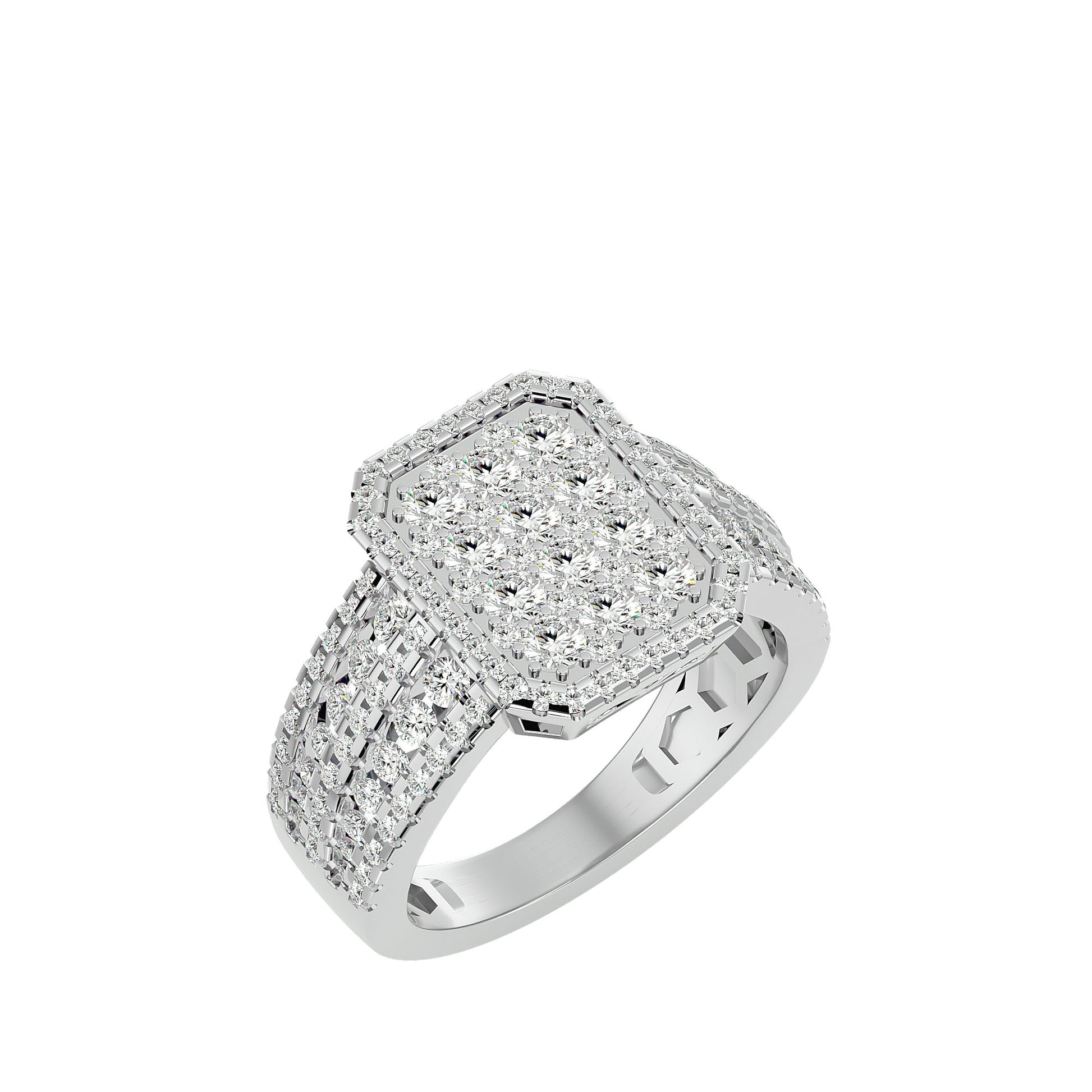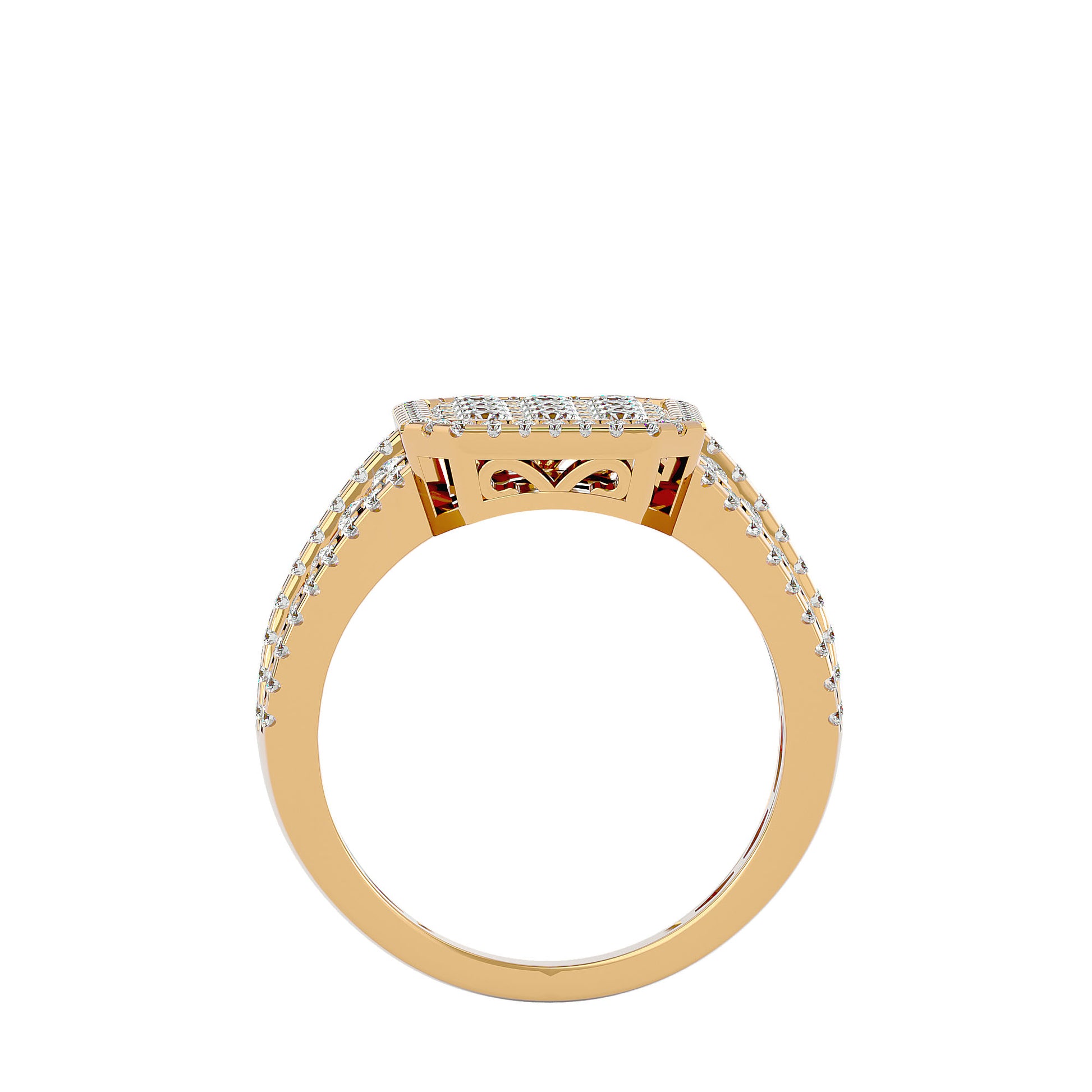 A round diamond men's ring featuring a center emerald-shaped motif filled with diamonds set in plate prongs, with side diamonds arranged alternately in channel and plate prong settings for a bold and sophisticated look.