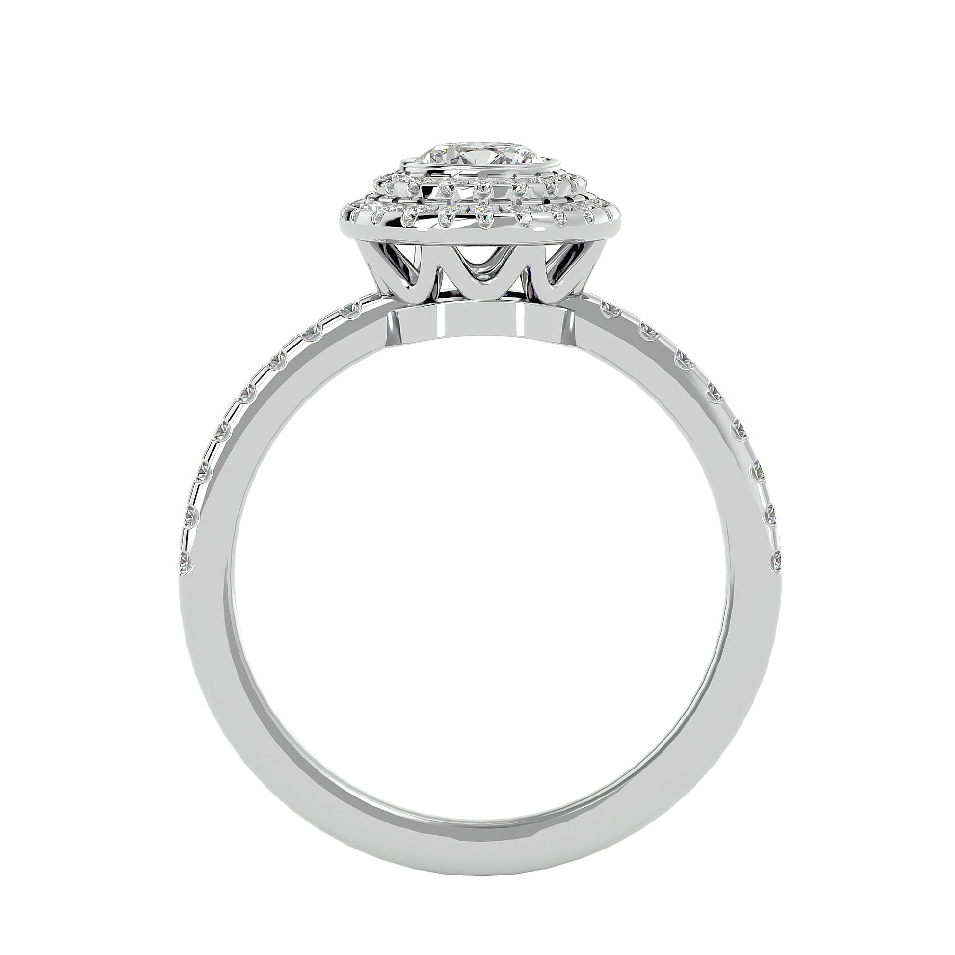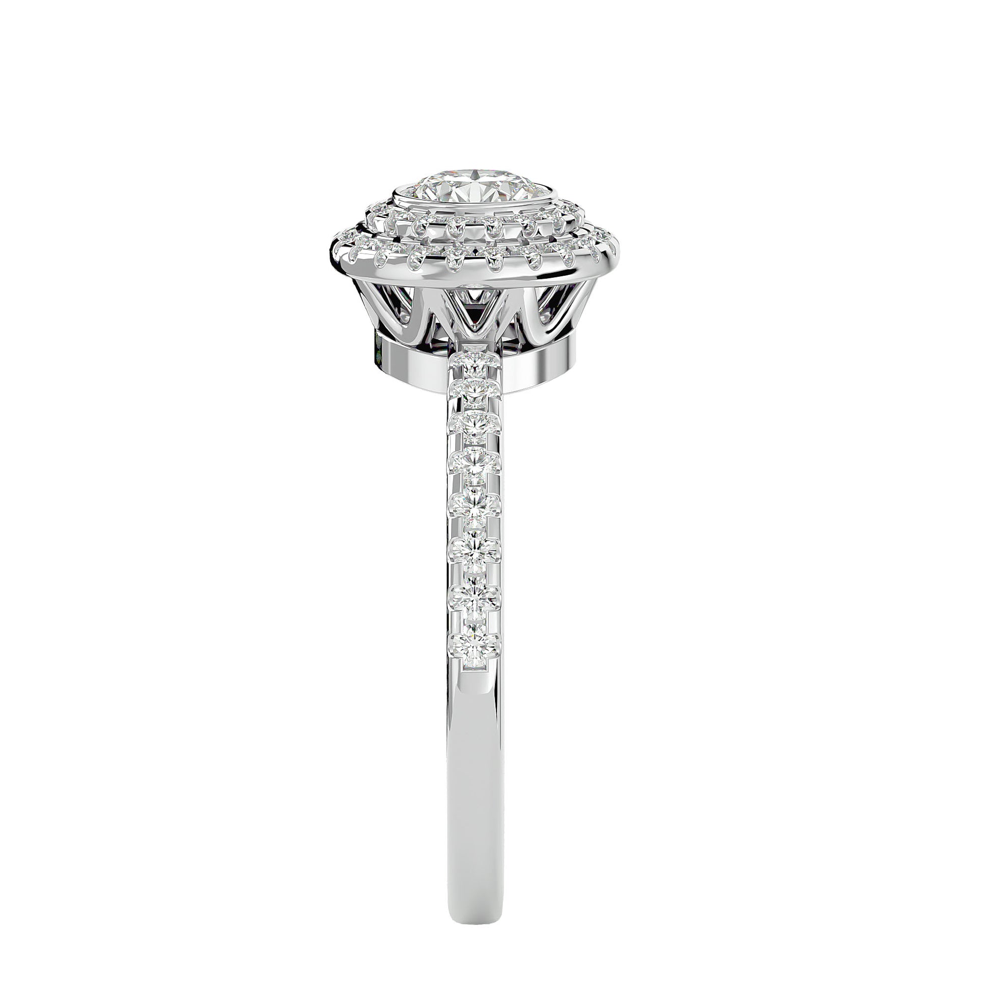 The Misha Double Halo Diamond Engagement Ring features a striking center diamond set in a sleek bezel, surrounded by two halos of diamonds set in intricate micro-prong settings. The band showcases diamonds set in micro-prong settings, with a beautiful basket setting design that enhances the overall elegance. This ring exudes sophistication and radiance from every angle.