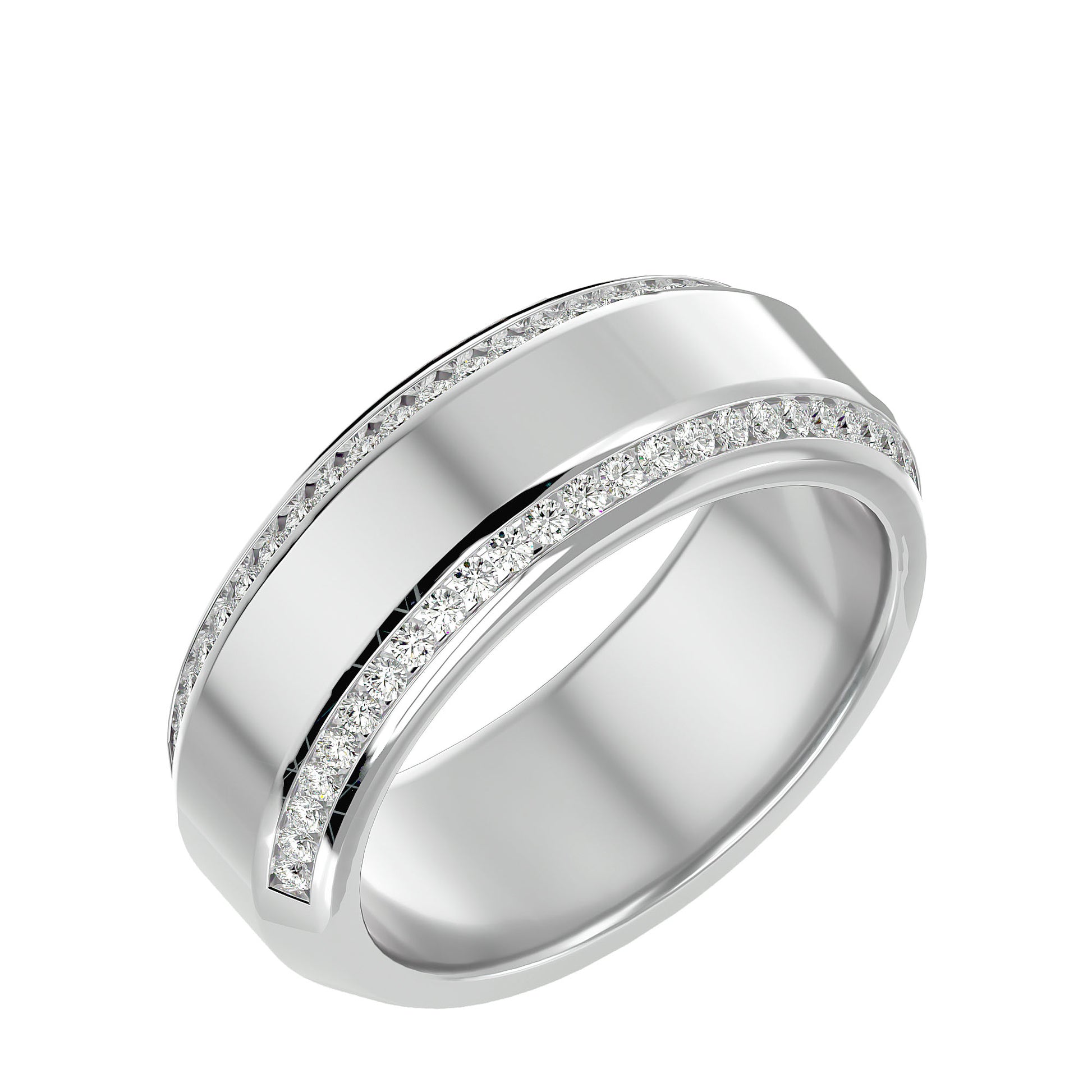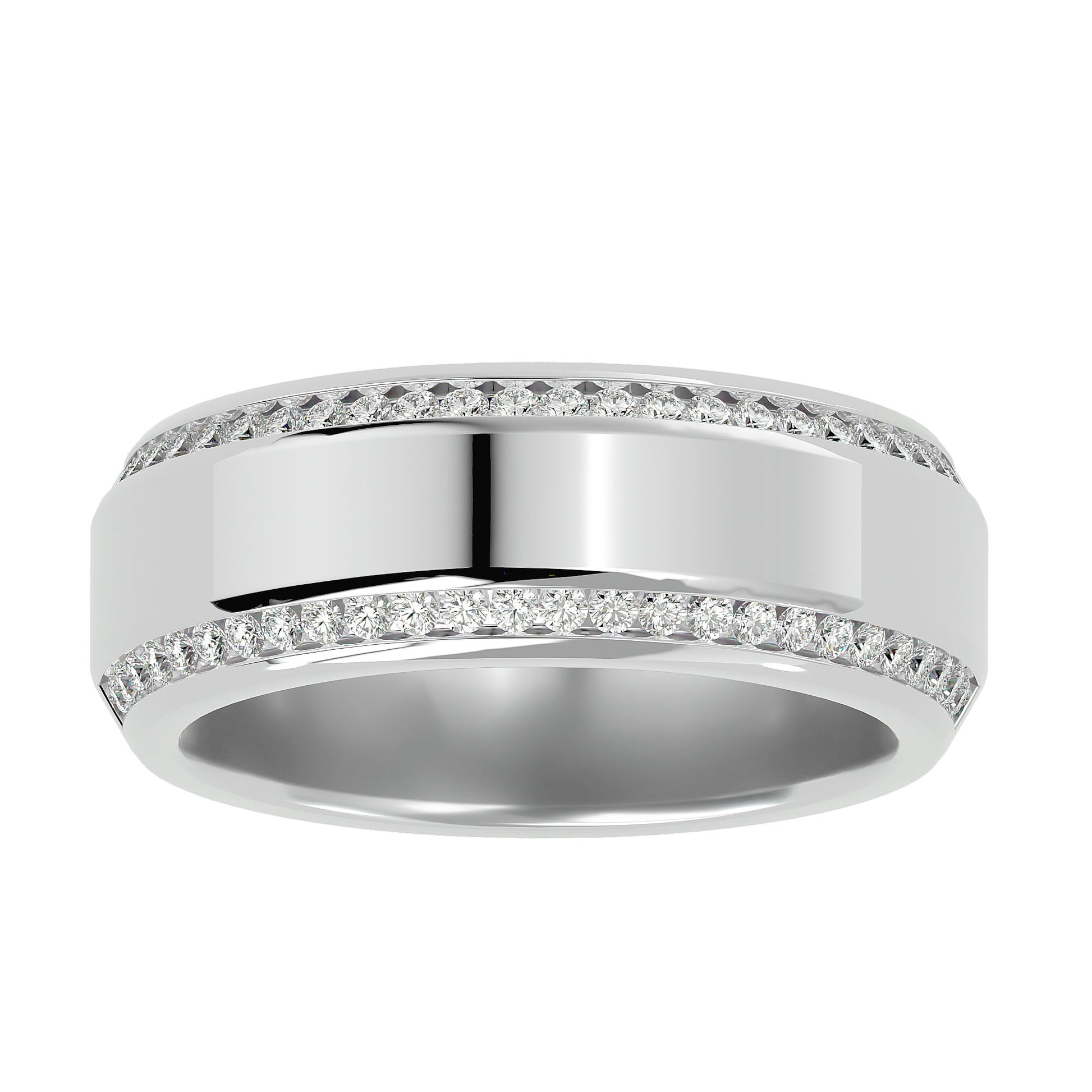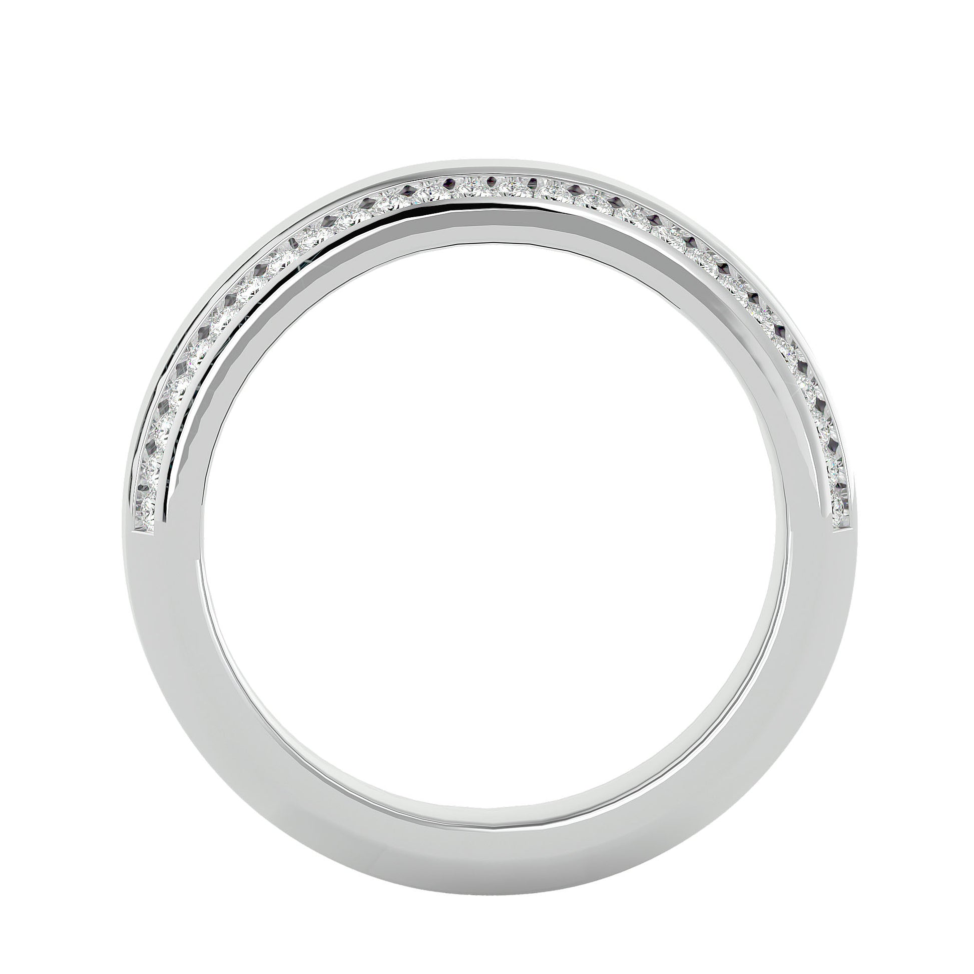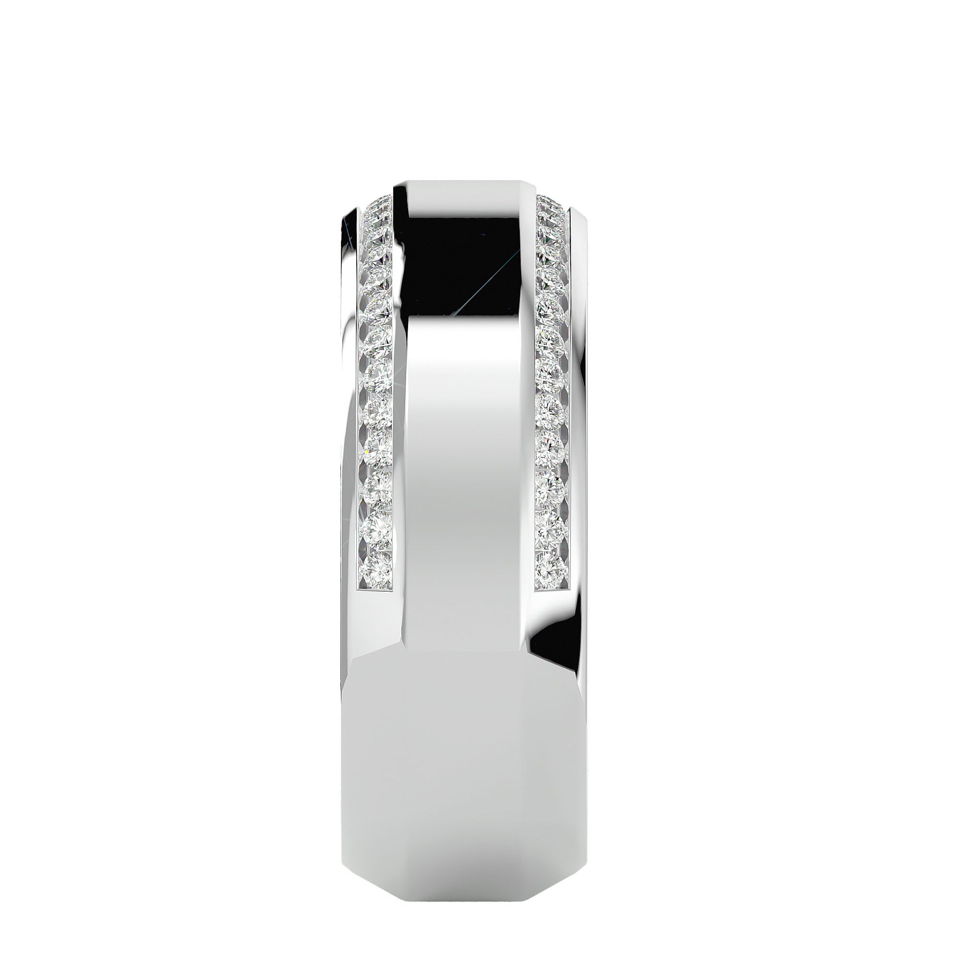 A thick, broad band featuring a pave setting of small diamonds, with two rows of sparkling diamonds encircling the band. The design offers a bold and luxurious look, perfect for adding a touch of elegance and brilliance to any occasion.
