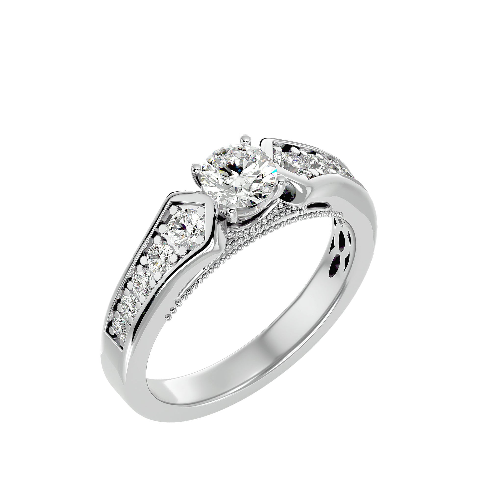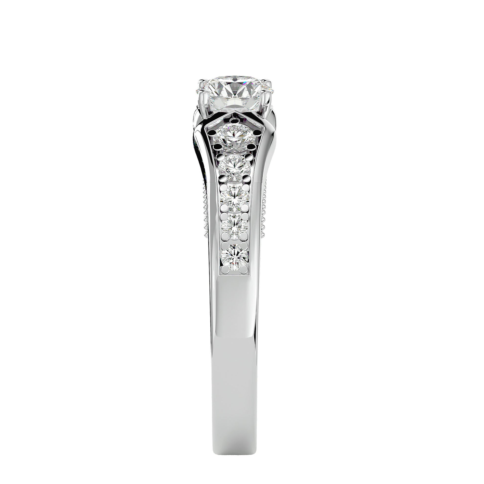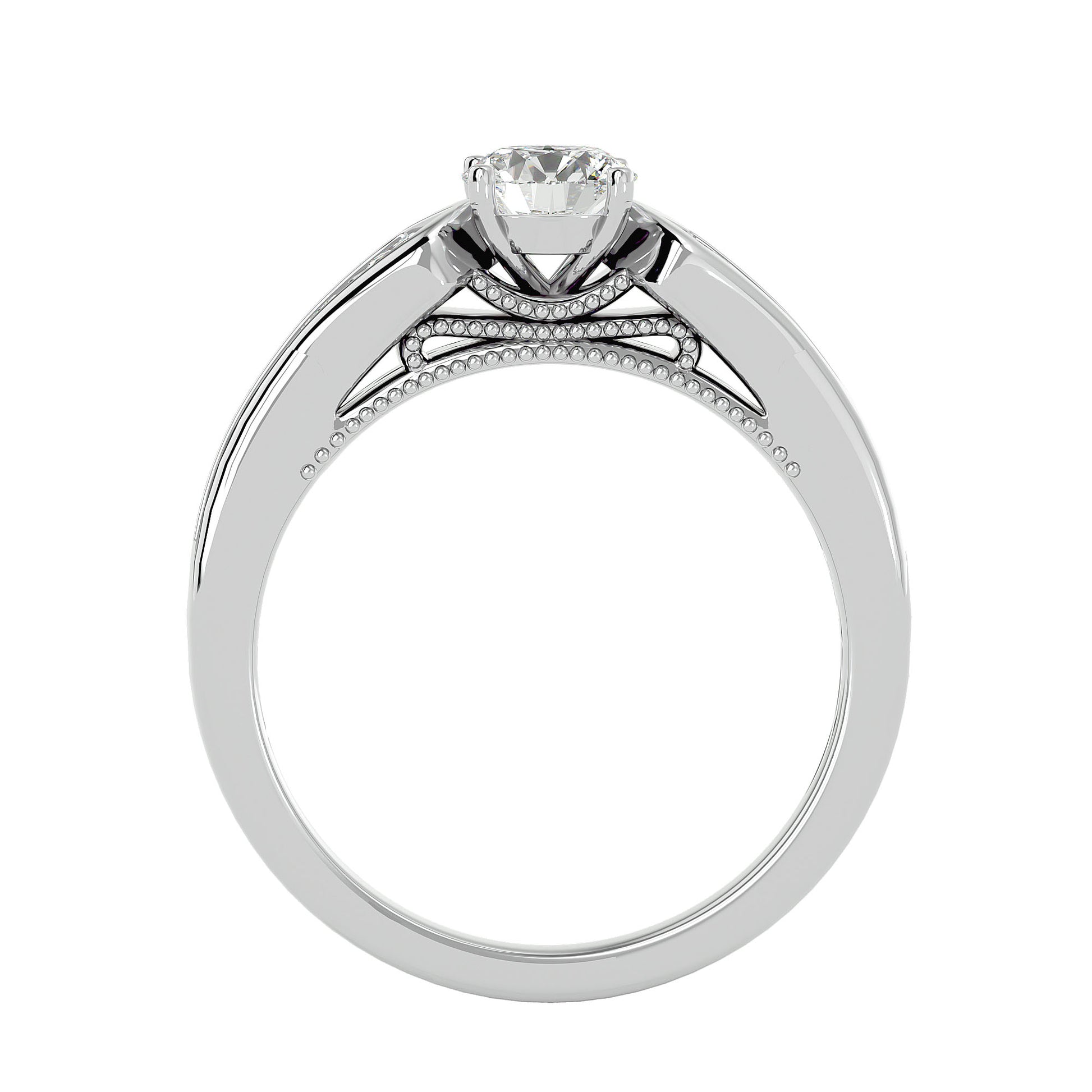 The Saskia diamond engagement ring features a center diamond set in a classic 4-prong setting with a high-profile design. From the side view, delicate milligrain detailing enhances the overall design. The shank is adorned with pave-set diamonds, adding extra sparkle and creating a sophisticated, elegant look.