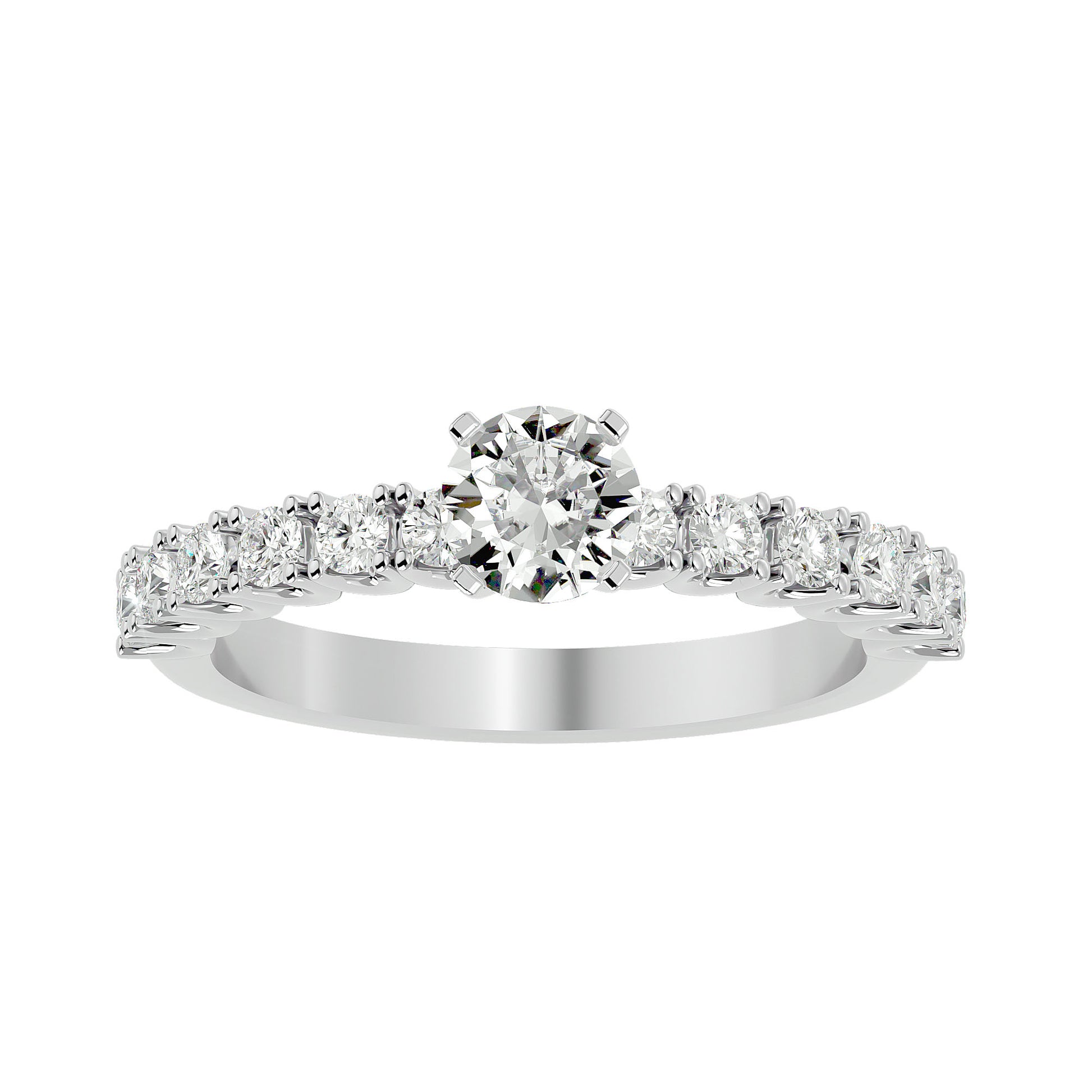 The Sylvia diamond engagement ring features a stunning center diamond set in a classic 4-prong setting, with side diamonds set in "U" prong settings. All the diamonds are set on one level, creating a sleek, seamless design that enhances the ring's elegant and modern appeal.